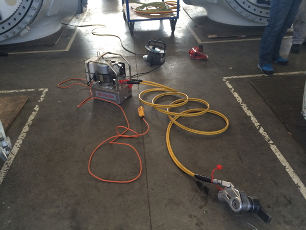 公司派遣技術(shù)員乘坐飛機前往,經(jīng)過3個小時的飛行,技術(shù)員來到了這家風(fēng)電設(shè)備制造廠,與此同時液壓扳手泵、液壓扳手、高壓軟管成套設(shè)備已通過物流到達了該風(fēng)電設(shè)備制造廠現(xiàn)場。